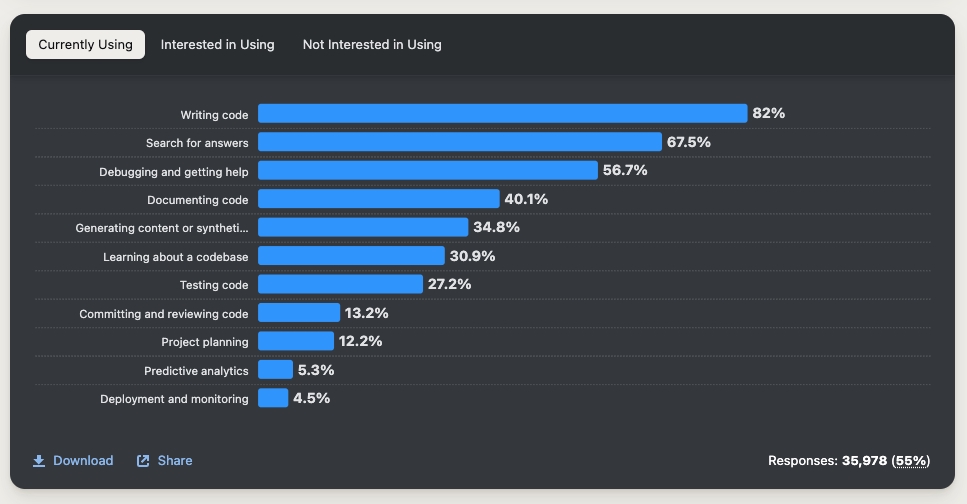 Los asistentes de IA generativa integrados en el IDE soportan muchos más casos de uso que la escritura de código. En la imagen podemos ver un reporte de Stackoverflow sobre el uso de la IA en 2024, donde se aprecia cómo se está utilizando la tecnología por los desarrolladores.